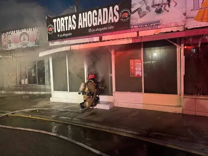 Alrededor de la medianoche, el Cuerpo de Bomberos de Cabo San Lucas atendió el reporte de un incendio en varios locales comerciales ubicados frente al estadio, sobre el camino al Faro.